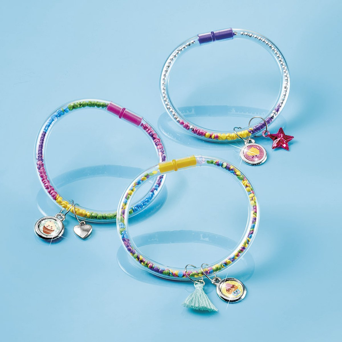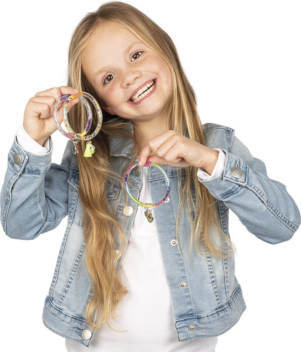 Include: 3 tuburi transparente, peste 2400 de pietricele colorate, stralucitoare, abtibilduri holografiuce, pandantiv in forma de inima si stea.