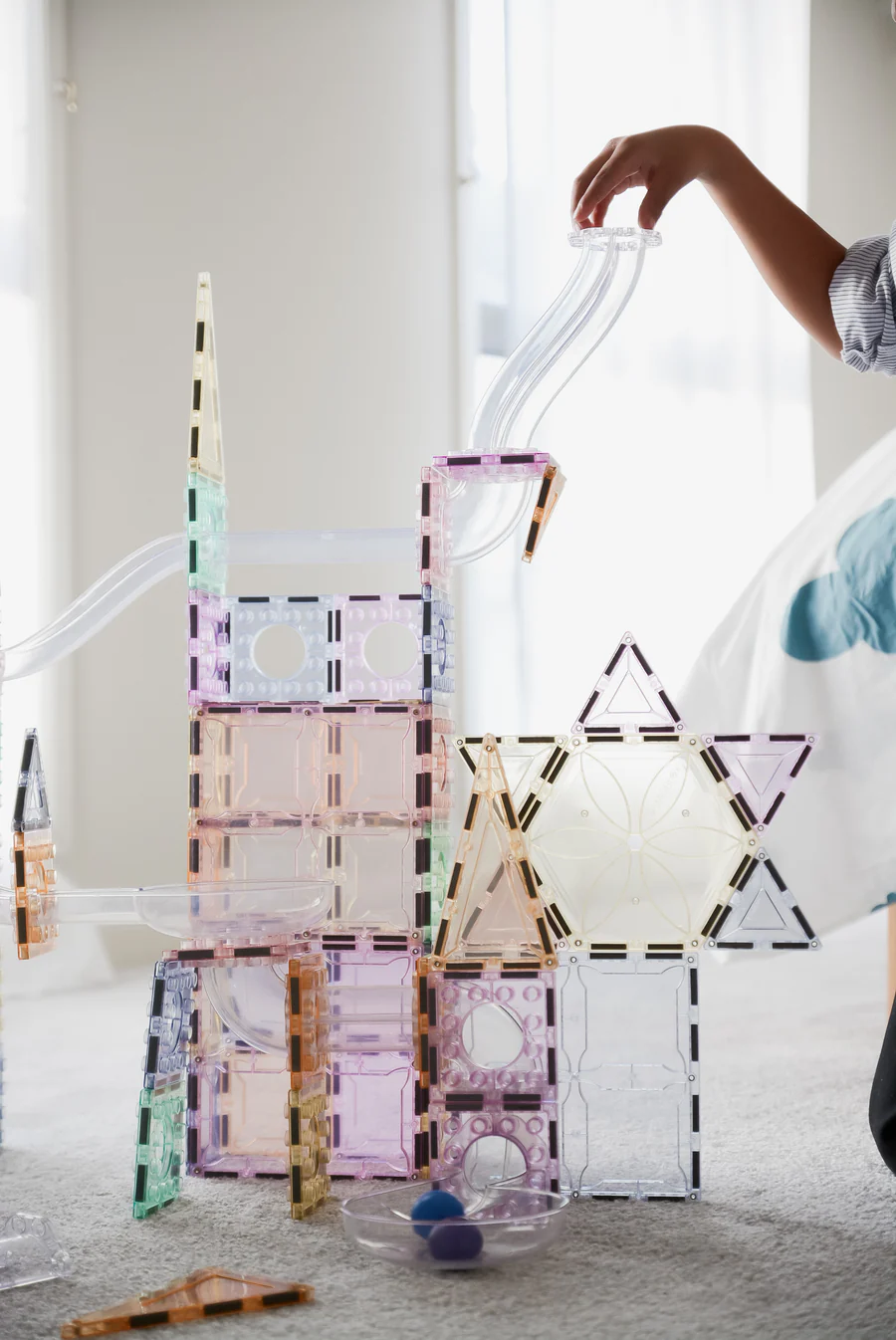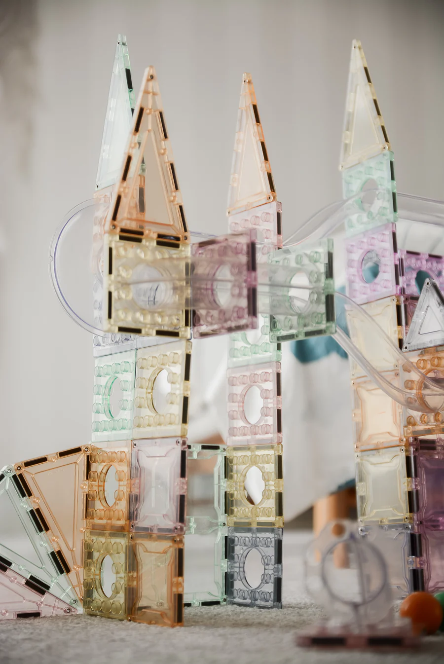 Setul magnetic Magbrix Ball Run Pastel contine 98 piese in culori pastel: