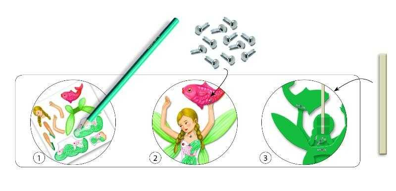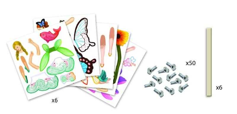 Setul conține 6 modele de zâne minunate pe care trebuie să le colorezi și apoi să le asamblezi cu ajutorul pionezelor milton.