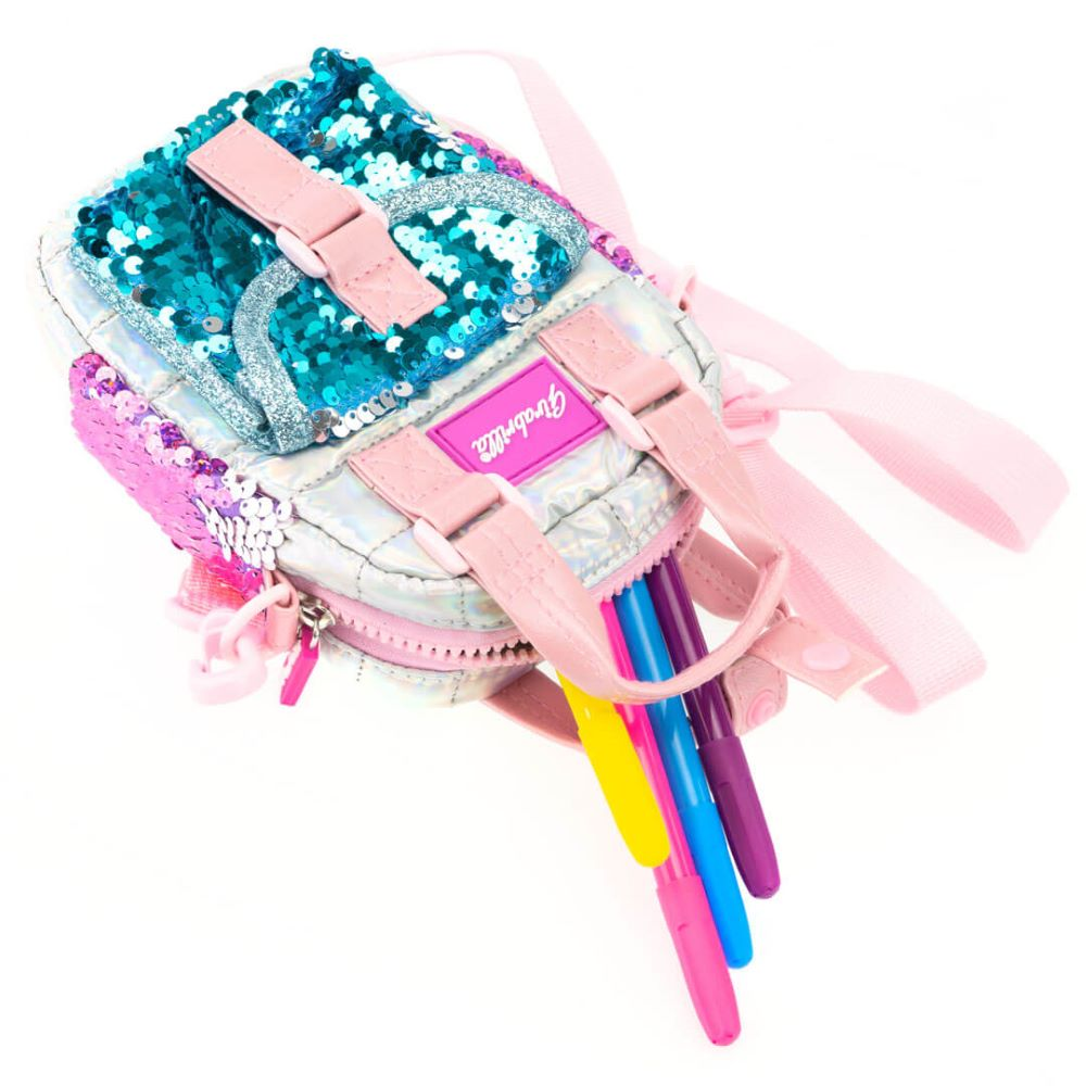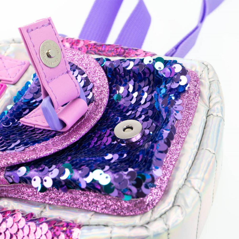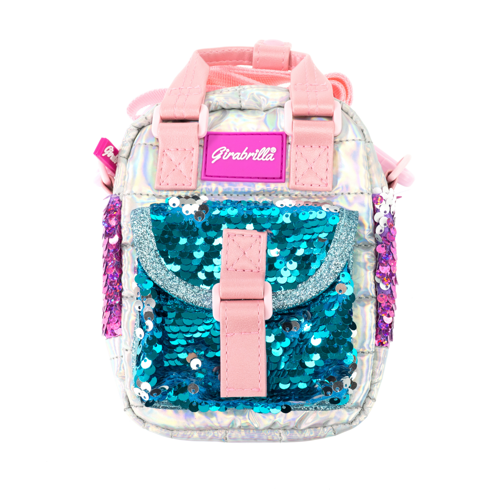Gentuța Girabrilla Puffer este o geantă de umăr adorabilă, realizată din materiale de înaltă calitate, moi la atingere, în culori irizate. Practică și stilată, poate fi folosită pentru diverse activități zilnice – de la plimbări, la depozitarea obiectelor personale sau chiar ca port-telefon (în funcție de dimensiune). Geanta are un buzunar frontal cu închidere magnetică și paiete reversibile Girabrilla, iar compartimentul principal este prevăzut cu fermoar. Interiorul este căptușit cu nylon impermeabil. Se poate purta pe umăr datorită curelei reglabile sau manual, cu ajutorul celor două mânere textile de sus.