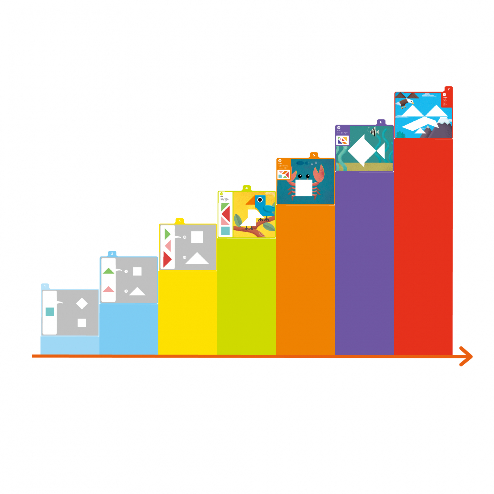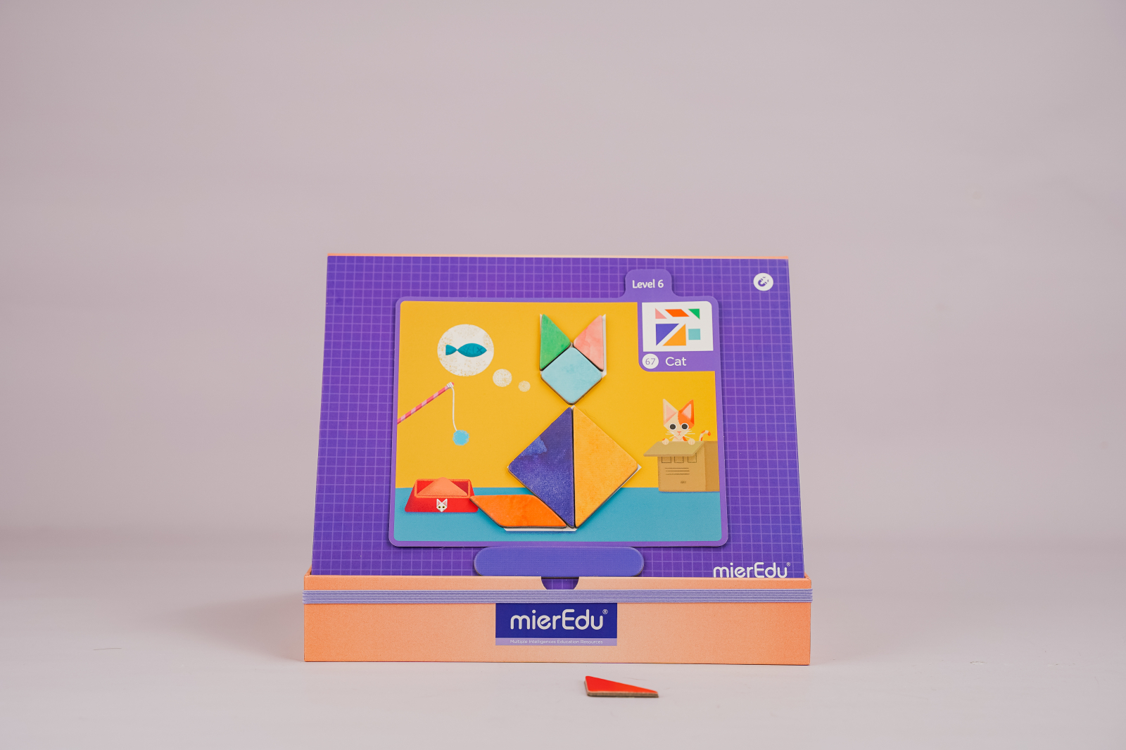Include: 1 kit de joc | 7 piese magnetice Tangram | 32 de cartonase cu două fețe | 1 suport de cartonase | 1 bară magnetică